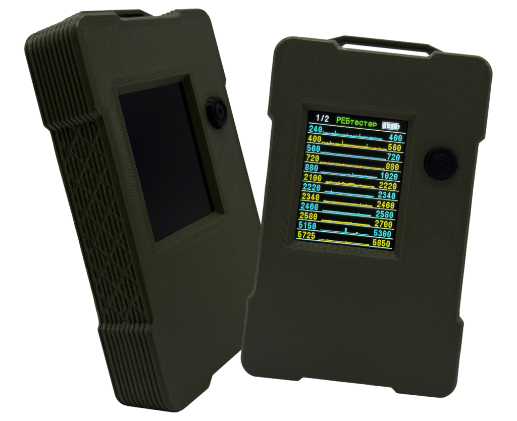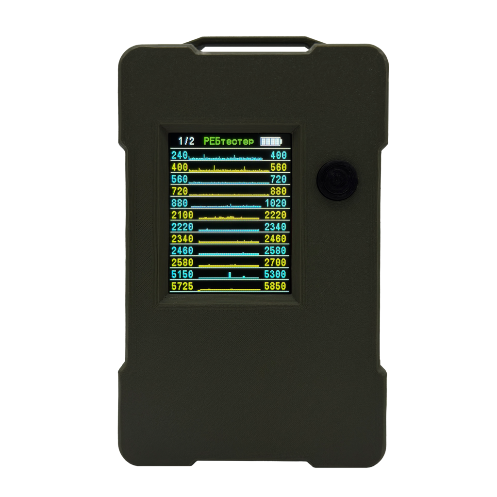 Корпус виконаний з ударостійкого матеріалу, а кольоровий дисплей забезпечує наочну індикацію активності сигналів. Просте керування, компактний розмір і автономна робота роблять його ідеальним вибором для військових, волонтерів і спеціалістів зв'язку.